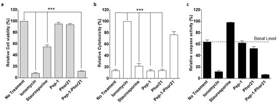 Characterization of the cell-killing mechanism utilized by Pep-1-Phor21. MDA-MB-231 cells were treated with peptides: Pep-1-Phor21, Pep-1, or Phor21 (20 µM); staurosporine (10 µM); or ionomycin (150 µM). After 6 h, cell viability (a), cytotoxicity (b), and apoptosis (c) were assessed by ApoTox-GloTM Triplex Assay. Individual Pep-1 or Phor21 peptides were inactive against MDA-MB-231 cells. In contrast, all other treatments induced a rapid loss of cell viability (a). Pep-1-Phor21 or ionomycin induced a significant increase in relative cytotoxicity, whereas staurosporine did not have a significant cytotoxic effect (Pep-1-Phor21: 76.7% ± 5.6; staurosporine: 21.7% ± 4.88, relative to non-treated cells: 13.8% ± 2.3) (b). In contrast, only staurosporine induced an increase in caspase 3/7 activity (34.6% ± 4.9 detectable increase above baseline), consistent with the induction of apoptosis in target cells (c). Data = mean value ± SEM of three independent experiments (*** p ≤ 0.001).