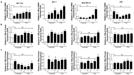 Epigenetic modulation of IL-13Rα2 expression in breast cancer cells. Non-malignant breast epithelial (MCF-10A), non-TNBC (MCF-7), and TNBC (MDA-MB 231, LM2) cell lines were treated with an HDAC inhibitor (TSA) or with a DNMT inhibitor (5-aza-dC) for 24 h and IL-13Rα2 expression at the mRNA, total protein, and cell-surface levels were subsequently measured by RT-PCR (a), Western blot (b), and cell-based ELISA (c), respectively. Treatment with either epigenetically active compound induced detectable levels (all assays) of IL-13Rα2 expression in MCF-7 cells, whereas expression was not altered in MCF-10A cells (remaining IL-13Rα2-negative). In IL-13Rα2-positive cells, 10 µM TSA significantly upregulated IL-13Rα2 expression in MDA-MB-231 cells, as measured in all assays. Data = mean value ± SEM of three independent experiments (* p ≤ 0.05; ** p ≤ 0.01; *** p ≤ 0.001; ns = non-significant; relative to untreated cells).
