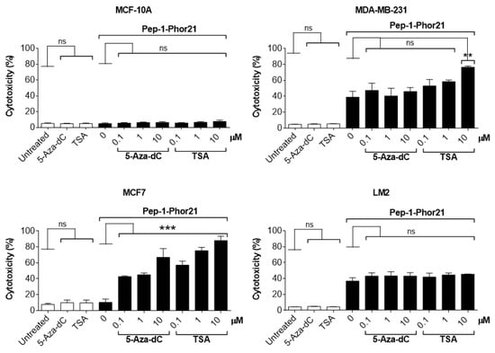 Effect of HDAC or DNMT inhibitors on Pep-1-Phor21-induced cytotoxicity. All cell lines were treated with 0–10 µM TSA or 5-aza-dC for 24 h. MCF-10A, MCF-7, MDA-MB-231, and LM2 cells were subsequently treated with 50 µM, 20 µM, 10 µM, or 0.5 µM Pep-1-Phor21, respectively, for 3 h, and their cytotoxicity was determined (CellTox assay). Pep-1-Phor21 had a demonstrable cytotoxic effect on non-TNBC MCF-7 cells only after pre-treatment with TSA- or 5-aza-dC. Similarly, Pep-1-Phor21 exhibited a significant increase in cytotoxic activity against TNBC MDA-MB-231 cells when pre-treated with 10 µM TSA. Data = mean value ± SEM from three independent experiments (** p ≤ 0.01; *** p ≤ 0.001; ns = non-significant; relative to untreated cells).