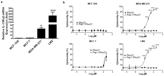IL-13Rα2 expression in breast cancer spheroids and targeting with Pep-1-Phor21. (a) IL-13Rα2 mRNA expression was determined by RT-PCR in the indicated cell lines cultured as 3-D spheroids for 48 h (fold-change relative to MCF-10A cells). (b) Established spheroids (48 h) were treated for 3 h with the indicated peptides (dose-response range = 0–120 µM) and their cytotoxicity was assessed (CellTox assay). Only IL-13Rα2-positive, TNBC spheroids exhibited susceptibility to the cytotoxic effect of Pep-1-Phor21 (MDA-MB-231, LM2; IC50 = 22.98 µM ± 1.5, 12.22 µM ± 2.5, respectively). Data = mean value ± SEM of three independent experiments (* p ≤ 0.05; *** p ≤ 0.001).