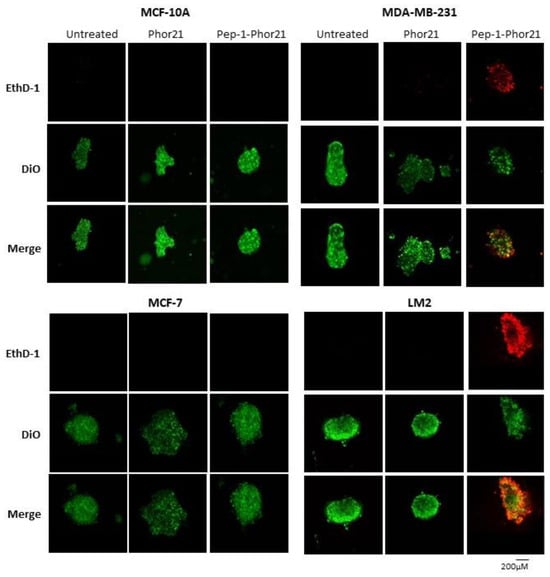 Confocal cell imaging of breast cancer spheroids treated with Pep-1-Phor21. Indicated cell lines established as spheroids (48 h) were treated with Pep-1-Phor21 or Phor21 (3 h, 30 µM) and assessed for the presence of live and dead cells using confocal fluorescent microscopy. IL-13Rα2-positive TNBC spheroids (MDA-MB-231, LM2) exhibited diffuse dead cell staining (red fluorescence, EthD-1) with the concomitant disruption of spheroid integrity after Pep-1-Phor21 treatment. Some foci of live cells (green fluorescence, Vybrant DiO) were detectable within the core of the disrupted spheroid after 3 h. In contrast, IL-13Rα2-negative MCF-10A breast epithelial and non-TNBC MCF-7 cells exhibited only viable cell staining with no observable loss of spheroid structure post-treatment.
