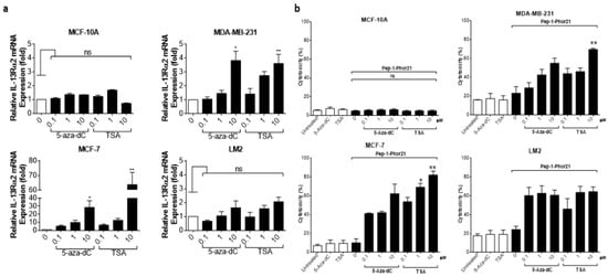 Given previous reports that IL-13Rα2 expression can be upregulated in certain cancers via epigenetic mechanisms [19], we sought to clarify whether IL-13Rα2 expression could be similarly enhanced in breast cancer cells, sensitizing them to Pep-1-Phor21 in the process. In particular, we determined the effects of treatment with an HDAC inhibitor (TSA), or with a DNMT (5-aza-dC) on IL-13Rα2 expression. The treatment of IL-13Rα2-negative non-TNBC MCF-7 cells with either TSA or 5-aza-dC for 24 h induced the detectable expression of IL-13Rα2 mRNA (Figure 6a), total IL-13Rα2 protein (Figure 6b), and cell-surface IL-13Rα2 expression (Figure 6c) in a dose-dependent manner. In contrast, this induction was not demonstrable in non-malignant MCF-10A cells. Although the TNBC-type cell lines already expressed relatively high levels of IL-13Rα2, significantly increased expression was detectable in 10µM TSA-treated MDA-MB-231 cells, with the LM2 sub-line exhibiting further marginal increases in expression.