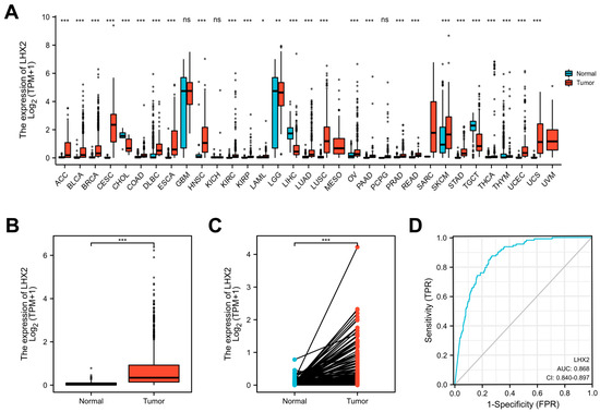 Differential expression levels of LHX2 in different malignancies. (A) The expression of LHX2 in various cancers compared with in normal tissues in TCGA database. (B,C) Differential expression level of LHX2 in BRCA. (D) An ROC curve to test the value of LHX2 in identifying BRCA tissues. * p < 0.05, ** p < 0.01, *** p < 0.001.
