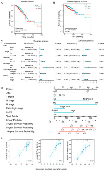 Prognostic analysis of LHX2 in BRCA. (A,B) Kaplan–Meier overall survival (OS) and disease-specific survival (DSS) for samples in high- and low-LHX2 groups in BRCA in TCGA database. (C) LHX2 was found to be an independent prognostic factor using univariate and multivariate Cox regression analyses. (D) A nomogram based on LHX2, age, T stage, N stage, M stage, and pathological stage. (E) Calibration plots of the nomogram for predicting the probability of OS at 3, 5, and 10 years.