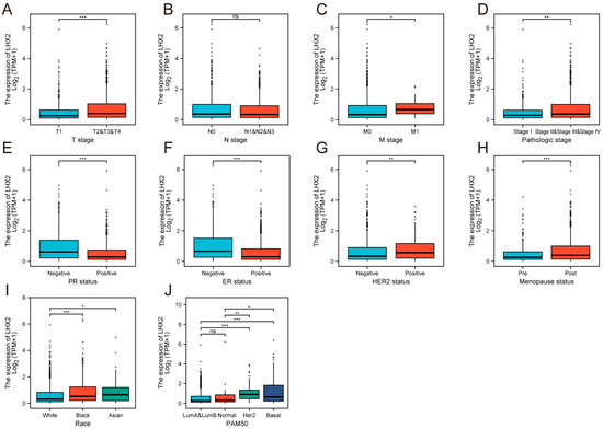 Correlation between the expression of LHX2 and clinicopathological characteristics of BRCA, including (A) T stage, (B) N stage, (C) M stage, (D) pathological stage, (E) PR status, (F) ER status, (G) HER2 status, (H) menopause status, (I) race, and (J) PAM50 in TCGA database. * p < 0.05, ** p < 0.01, *** p < 0.001.