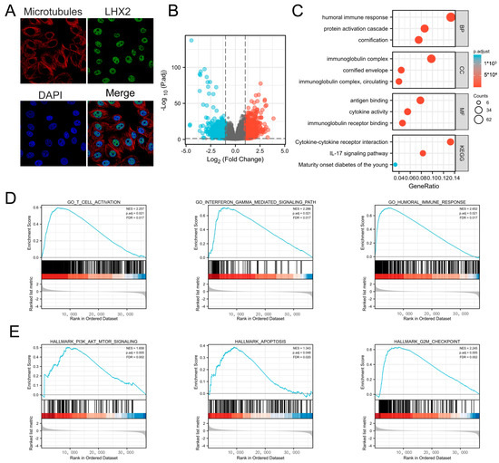 To further clarify the function of LHX2, we confirmed the subcellular location of LHX2. It is mainly localized to the cell nucleus according to the human protein atlas (https://www.proteinatlas.org/ENSG00000106689-LHX2/subcellular#human accessed on 23 April 2023) (Figure 4A) and usually acts as a transcription factor in the cell nucleus [8]. Then, we calculated the DEGs between the LHX2-high and LHX2-low groups in BRCA (adjusted p-value < 0.05, |Log2-fold change| > 1.5) (Figure 4B). Subsequently, we conducted GO and KEGG enrichment analyses to explore the functional enrichment information of LHX2-related genes. In terms of biological processes, LHX2-related genes are involved in the humoral immune response, the protein activation cascade, and cornification. With regard to cell components, LHX2-related genes are gathered in the immunoglobulin complex, cornified envelope, and immunoglobulin complex, circulating. Regarding molecular functions, these genes are enriched in antigen binding, cytokine activity, and immunoglobulin receptor binding. The KEGG analysis showed that LHX2-related genes were enriched in the cytokine–cytokine receptor interaction, the IL-17 signaling pathway, and maturity-onset diabetes of the young (Figure 4C). Finally, GSEA illustrated significantly enriched pathways in the high-LHX2-expression phenotype, including the T-cell activation pathway, interferon-gamma-mediated signaling pathway, humoral immune response pathway, PI3K/AKT/mTOR signaling pathway, apoptosis pathway, and G2M checkpoint pathway (Figure 4D,E).