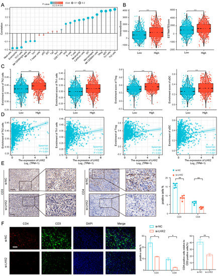 The expression level of LHX2 was correlated with the immune infiltration of BRCA. (A) Correlation between 24 immune cells and the expression of LHX2 in BRCA. (B) The immune score and ESTIMATE score in low-LHX2-expression and high-LHX2-expression groups in BRCA. *** p < 0.001. (C) The plots show the differential infiltration levels of Th2 cells, Th1 cells, Treg cells, and activated DC cells between LHX2-low and -high groups. *** p < 0.001. (D) Correlation diagrams illustrate the positive correlation between enrichment of Th2 cells, Th1 cells, Treg cells, and activated DC cells and the expression of LHX2. (E) Immunohistochemistry analyses of CD3 and CD4 protein expressions in si-NC and si-LHX2 groups. Data represent mean ± SEM, ** p < 0.01, scale bar 50 μM. (F) Double immunofluorescence labeling of CD3 and CD4 protein expressions in si-NC and si-LHX2 groups. Data represent mean ± SEM, * p < 0.05, ** p < 0.01, scale bar 20 μM.