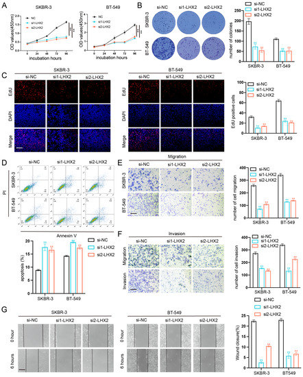 Downregulation of LHX2 inhibited breast cancer cell proliferation, migration, and invasion ability and promoted apoptosis in vitro. (A) CCK8 assays were performed to determine proliferation of SKBR-3 and BT-549 cells after transfection of siRNA of LHX2. ** p < 0.01. (B) Colony formation assays of SKBR-3 and BT-549 cells after downregulation of LHX2. ** p < 0.01. (C) EdU assays of SKBR-3 and BT-549 cells transfected with siRNA of LHX2. ** p < 0.01, scale bar 100 μM. (D) Apoptosis in SKBR-3 and BT-549 cells after transfection of shRNA of LHX2 analyzed using flow cytometry. ** p < 0.01. (E,F) Transwell assays were used to investigate the changes in migration and invasiveness capability of SKBR-3 and BT-549 cells after downregulation of LHX2. ** p < 0.01, scale bar 100 μM. (G) Wound healing assays were used to investigate the changes in migration capability of SKBR-3 and BT-549 cells after downregulation of LHX2. ** p < 0.01, scale bar 100 μM.