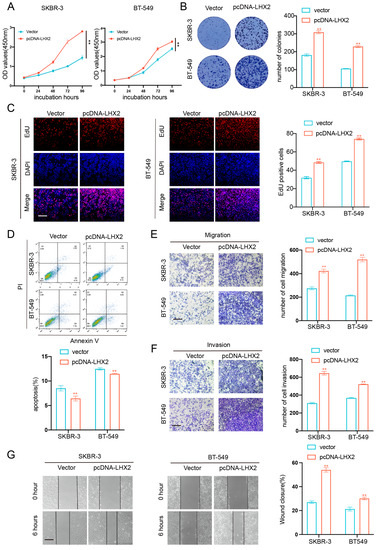 Overexpression of LHX2 promoted breast cancer cell proliferation, migration, and invasion ability and suppressed apoptosis in vitro. (A) CCK8 assays detected proliferation of SKBR-3 and BT-549 cells after overexpression of LHX2. ** p < 0.01. (B) Colony formation assays of SKBR-3 and BT-549 cells transfected with an overexpression plasmid of LHX2. ** p < 0.01. (C) EdU assays of SKBR-3 and BT-549 cells after transfection of overexpression plasmid of LHX2. ** p < 0.01, scale bar 100 μM. (D) Apoptosis in SKBR-3 and BT-549 cells after transfection of overexpression plasmid of LHX2 analyzed using flow cytometry. ** p < 0.01. (E,F) Transwell assays investigated the changes in migration and invasiveness capabilities of SKBR-3 and BT-549 cells after overexpression of LHX2. ** p < 0.01, scale bar 100 μM. (G) Wound healing assays investigated the changes in migration capability of SKBR-3 and BT-549 cells after overexpression of LHX2. ** p < 0.01, scale bar 100 μM.