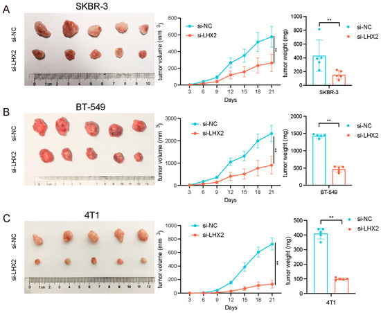 LHX2 regulates breast cancer cell proliferation in vivo. (A,B) shLHX2 was stably transfected into SKBR-3 and BT-549 cells and then injected into nude mice. (C) 4T1 cells were stably transfected with shLHX2 and then injected into C57BL/6 mice. Tumor volumes were calculated using the following formula: (shortest diameter)/2 × (longest diameter)/2. Tumor weights are represented as the means of tumor weights ± S.D. (standard deviation). ** p < 0.01.