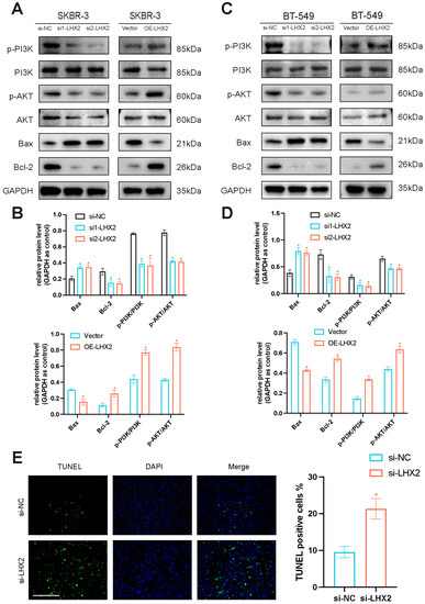 According to our previous GSEA results, the PI3K/AKT/mTOR pathway and apoptosis pathway were enriched in the high-LHX2-expression phenotype. As was reported, LHX2 can promote the malignant behaviors of tumors through AKT signaling [11]. AKT can promote the progression of breast cancer through the action of HSP90 [12]. The PI3K/AKT pathway played a major role in tumorigenesis [13,14,15,16], and it interacts with the apoptosis pathway by inhibiting Bcl-2 [17]. LHX2 was found to induce autophagy through mTOR signaling [18]. To establish whether LHX2 activates the PI3K/AKT/mTOR pathway and apoptosis pathway in breast cancer, we conducted a Western blotting assay to detect the signature proteins in these pathways, including PI3K, p-PI3K, Akt, p-Akt, Bcl-2, and Bax. Phosphoinositide 3-kinase (PI3K) and Akt served to maintain cell proliferation and apoptosis [17]; P-Akt and p-PI3K are their active forms. Akt is a key effector of PI3K and an important survival kinase [19]; Akt signaling contributes to tumor growth and progression [20]. Bcl-2 inhibits apoptosis, and Bax is an important protein that promotes apoptosis; the functional interaction between them is conserved [21]. As a result, LHX2 overexpression upregulated p-PI3K, p-Akt, and Bcl-2, while it suppressed Bax in both SKBR-3 cells and BT-549 cells. By contrast, the LHX2 downregulation groups recorded the opposite results. The Western blot results indicated that LHX2 activated the PI3K/AKT/mTOR pathway and apoptosis pathway in breast cancer, and it inhibited the apoptosis of BRCA (Figure 9A–D). We also performed a TUNEL assay on tumor tissues, and compared with the si-NC group, the TUNEL-positive cells of si-LHX2 were significantly increased (Figure 9E), indicating that LHX2 inhibited apoptosis in breast cancer, which was consistent with the results of the Western blotting assay; thus, the results complemented each other.