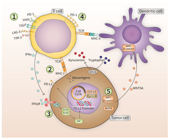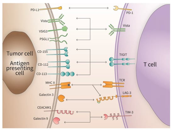 New IC proteins have been discovered, including the V-domain Ig suppressor of T cell activation (VISTA), T cell immunoreceptor with Ig and immunoreceptor tyrosine-based inhibitory motif (TIGIT), lymphocyte-activation gene 3 (LAG-3), T cell immunoglobulin and mucin-domain containing 3 (TIM3) and others. Tumors not only disrupt the functional surveillance by ICs to avoid initiation of apoptotic clearance but also contribute to therapeutic resistance through the upregulation of other ICs. This process protects tumor cells by warding off the anti-tumor response from the immune system especially from CD8+ cytotoxic T lymphocytes [22]. These interactions between different ICs are depicted in Figure 1.