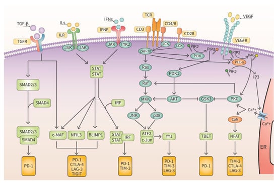 VISTA receptor is a relatively new IC discovered in 2011 [23]. After its identification, the role of VISTA in tumor progression and metastasis has been studied intensively. VISTA has two ligands and its affinity for these ligands depends on the acidity of the cellular environment [24]. The TME is usually acidic, and this could center VISTA as an actionable molecular target. Currently, several clinical trials are being conducted to determine the efficacy of anti-VISTA therapeutic antibodies. TIGIT was discovered in 2009 by three different laboratories [25,26,27] and the operative mechanism of TIGIT is not fully understood yet. TIGIT has been implicated in tumorigenesis and metastasis however, and it is being evaluated clinically as an effective therapeutic target. LAG-3 was discovered in 1990 in natural killer (NK) cells [28]. The discovery of its ligand, major histocompatibility complex II (MHCII) has further enhanced the understanding of how LAG-3 downregulates the functioning of CD4+ T lymphocytes [29]. There are several ongoing clinical trials targeting LAG-3 in human tumors. TIM-3 was discovered in 2002 on the cell surface of Th1 T lymphocytes [30] and was described as a negative regulator of immune cells. As TIM3 levels were downregulated when Th1 T lymphocytes were activated [30]. The most prominent IC is PD-1. PD-1 was originally discovered in 1992 on the plasma membrane of CD8+ T lymphocytes [31]. Although it was thought to be involved in programmed cell death, the mode of action was unknown until the discovery of its ligand, program cell death ligand 1 (PD-L1) in 1999 [31,32]. Upon observation that PD-L1 suppresses the functionality of CD8+ T lymphocytes following ligation to its receptor, PD-1, it was concluded that PD-1 is an IC [33]. Moreover, the elevated levels of PD-L1 on tumor cells suggested that PD-L1/PD-1 axis would be excellent therapeutic targets for oncological drugs [34]. There are a variety of signaling pathways implicated in the induction of ICs and this is depicted in Figure 2.