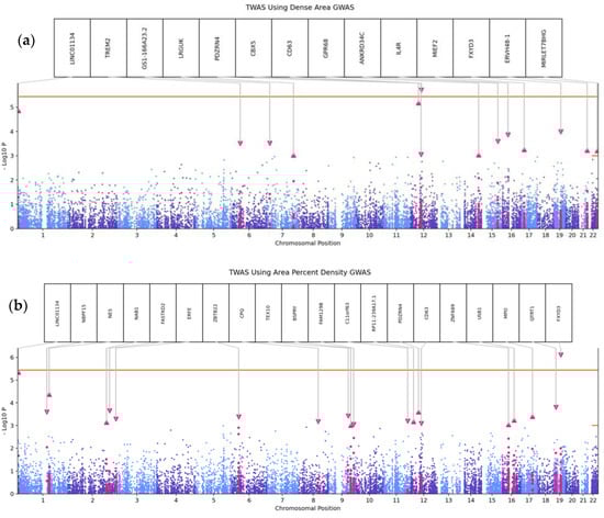 - Chen, H.; Fan, S.; Stone, J.; Thompson, D.J.; Douglas, J.; Li, S.; Scott, C.; Bolla, M.K.; Wang, Q.; Dennis, J.; et al. Genome-wide and transcriptome-wide association studies of mammographic density phenotypes reveal novel loci. Breast Cancer Res. BCR 2022, 24, 27. [Google Scholar] [CrossRef] [PubMed]