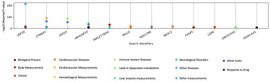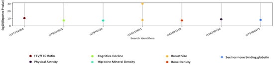 - Sollis, E.; Mosaku, A.; Abid, A.; Buniello, A.; Cerezo, M.; Gil, L.; Groza, T.; Gunes, O.; Hall, P.; Hayhurst, J.; et al. The NHGRI-EBI GWAS Catalog: Knowledgebase and deposition resource. Nucleic. Acids Res. 2023, 51, D977–D985. [Google Scholar] [CrossRef]
