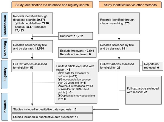 Figure 1 displays the flow diagram of study selection based on PRISMA [52]. We identified thirty thousand two hundred and forty-nine papers through databases (Embase, Pubmed/Medline, and Scopus) and citation searching, and screened thirteen thousand two hundred and eighty-five papers after removing duplicates. First, we ruled out thirteen thousand two hundred and eight papers by title and abstract since their subject, exposure or outcome were irrelevant to our study. We assessed seventy-eight studies by full-text review and included studies with international WHO or Asian-Pacific BMI cut-off points. We also took into account some papers with the BMI classifications fairly equal to these cut-off values [53,54]. Finally, thirteen cohort studies were assessed by NOS and included in the analysis. Table 1. shows the characteristics of included studies and their multivariate adjustment in brief). (Supplementary Table S2 shows full detail of adjusted factors). One study was conducted in six states of the USA, one study in ten European countries (Denmark, France, Germany, Greece, Italy, the Netherlands, Norway, Spain, Sweden, and the United Kingdom), one in four Asian countries (based on thirteen cohorts from China (two), Japan (eight), Korea (two), and Singapore (one)), one in Japan, two in China, four in Republic of Korea, and one study were conducted in Austria, Norway, and the UK (Supplementary Figure S1).