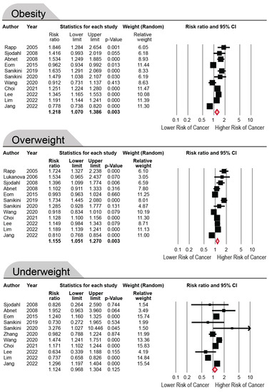 - Renehan, A.G.; Tyson, M.; Egger, M.; Heller, R.F.; Zwahlen, M. Body-mass index and incidence of cancer: A systematic review and meta-analysis of prospective observational studies. Lancet 2008, 371, 569–578. [Google Scholar] [CrossRef]