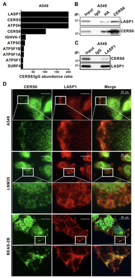 LASP1 is a CERS6 binding partner. (A) CERS6-binding proteins identified by IP with the anti-CERS6 antibody and LC-MS/MS analysis. The top ten candidates based on abundance ratio (anti-CERS6 antibody-bound samples vs. those from anti-IgG antibody) are listed. (B) CLIP-WB with anti-CERS6 or anti-HA to show LASP1 interaction with CERS6. A549 cells with overexpression of CERS6-HA were incubated with 1% formaldehyde in RPMI1640, then the reaction was quenched using 125 mM of a glycine solution. Cells were harvested, lysed, and sonicated, then IP was performed using a Dynabeads co-IP kit, after which co-precipitated protein complexes were eluted, and subjected to SDS-PAGE and WB analyses. (C) IP-WB with anti-LASP1 to show CERS6 interaction with LASP1. After A549 cells were harvested and lysed, IP-WB was performed using a Dynabeads co-IP kit (see Materials and Methods). (D) Immunofluorescent staining of LASP1 and CERS6 at lamellipodia of A549, LNM35, and CERS6-overexpressed BEAS-2B cells. The Pearson’s coefficient values for A549, LNM35, and CERS6-overexpressed BEAS-2B were 0.702, 0.789, and 0.812, respectively. Original western blots are presented in File S1.