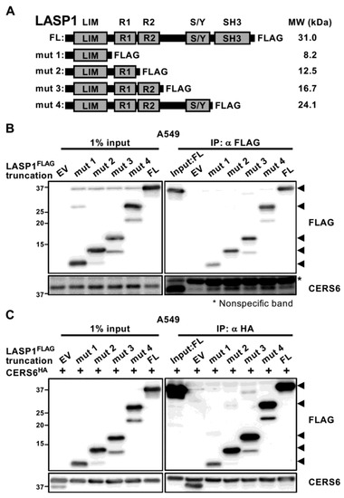 LIM domain of LASP1 required for CERS6 interaction. (A) Schematic illustration of C-terminal FLAG-tagged LASP1. The full-length (FL) and four truncated mutants (mut1-4) are shown. Predicted molecular weights are indicated. (B) IP-WB with an anti-FLAG antibody to precipitate LASP1-FLAG and demonstrate CERS6 interaction. EV, empty pCMV vector. Arrowheads: predicted positions for full-length and truncated LASP1. * Nonspecific band. (C) CERS6-HA was overexpressed in A549 cells and each truncated LASP1-FLAG mutant, then IP was performed using an anti-HA antibody. EV, empty pCMV vector. Arrowheads: predicted positions for full-length and truncated LASP1. Original western blots are presented in File S1.