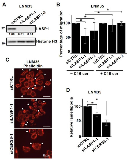LASP1 and CERS6 in the same axis, with a possible contribution to the promotion of cell migration. (A) WB analyses of LNM35 cells treated with siCTRL, siLASP1-1, and siLASP1-2 were performed. Relative values to histone H3 are indicated. (B) LNM35 cells were treated with siCTRL, siLASP1-1, or siLASP1-2; then, cell migration activity was determined in the presence or absence of 1 μM of C16 ceramide (C16 cer). At least 100 cells were counted and the results are shown as the mean ± SD value relative to that of siCTRLs. * p < 0.05, six independent experiments. (C) LNM35 cells were treated with siCTRL, siLASP1-1, or siCERS6-1, then fixed and stained with phalloidin. Scale bar = 40 μm. Arrowhead: lamellipodia. (D) Quantitative results are shown as values relative to siCTRL. At least 200 cells were counted and the results are shown as the mean ± SD. * p < 0.05, three independent experiments. Original western blots are presented in File S1.