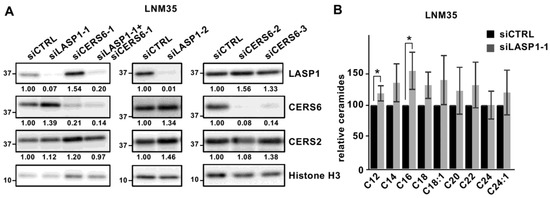 LASP1 and CERS6 modulated counterpart protein levels. (A) WB analysis of LNM35 cells was performed under knock-down conditions, as indicated. Relative values to histone H3 are shown. (B) Using LC-MS/MS, ceramide amounts were determined in siCTRL-treated (black) and siLASP1-1-treated (gray) LNM35 cells (n = 3). Quantitative values are shown as relative to siCTRL. * p < 0.05. Original western blots are presented in File S1.