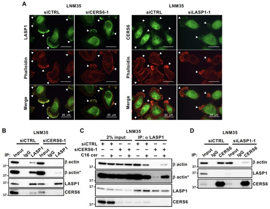 Association of β actin with LASP1 and CERS6. (A) Immunofluorescent staining of phalloidin and LASP1 or CERS6 at lamellipodia of LNM35 cells treated with siCTRL, siCERS6-1, or siLASP1-1. (B) IP-WB analysis was performed with the anti-LASP1 antibody to evaluate the interaction of LASP1–β actin. * Long exposure. (C) IP-WB analysis was performed with the anti-LASP1 antibody in the presence or absence of C16 ceramide (C16 cer) to evaluate interactions with LASP1–β actin. * Long exposure. (D) IP-WB analysis was performed with the anti-CERS6 antibody. Original western blots are presented in File S1.
