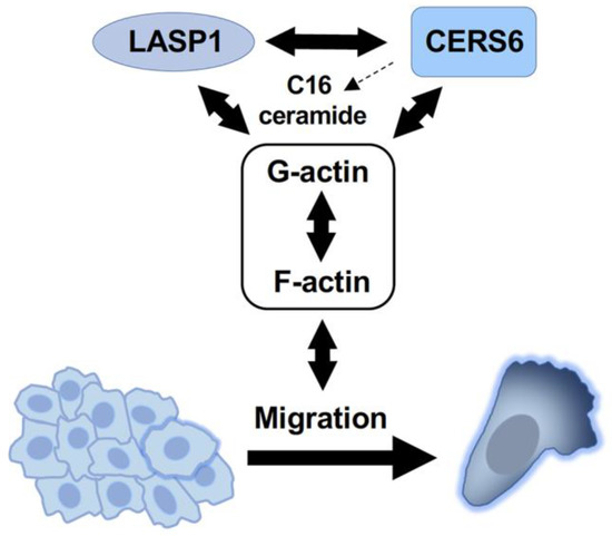 The present IP and LC-MS/MS analysis findings identified LASP1 as a CERS6 binding partner, and also identified the requirement of the LIM domain of LASP1 for the physical interaction. In addition to their interaction, LASP1 and CERS6 were found to coordinate in the promotion of cell migration and lamellipodia formation. Thus, it is proposed that these proteins function together to contribute to the cell migration process. In addition, LASP1 and CERS6 were revealed to interact with β actin, with the interaction of each decreasing with the depletion of the partner, while C16 ceramide partially rescued the LASP1–actin interaction under a CERS6 silencing condition. It is considered that the ternary complex of LASP1, CERS6, and actin may contribute to lamellipodia formation and cancer cell migration.