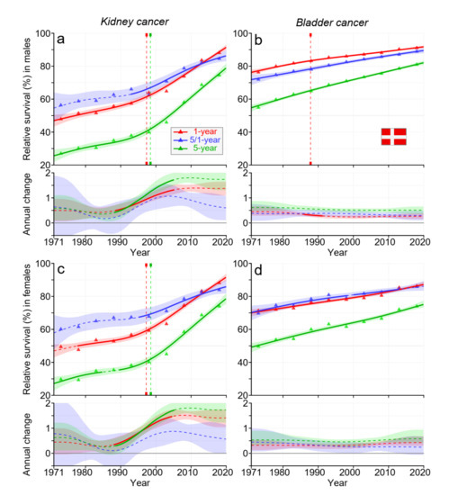 Relative 1-, 5/1-, and 5-year survival in Finnish men (a,b) and women (c,d) in kidney (a,c) and bladder (b,d) cancers. The vertical lines show significant breakpoints in survival trends, and the bottom curves show estimated annual changes in survival. The solid line in survival curves and annual change curve indicate a plausible trend (Section 2), whereas the dotted lines suggest otherwise. The shaded regions indicate 95% Bayesian credible intervals. All curves are color coded (see the insert).
