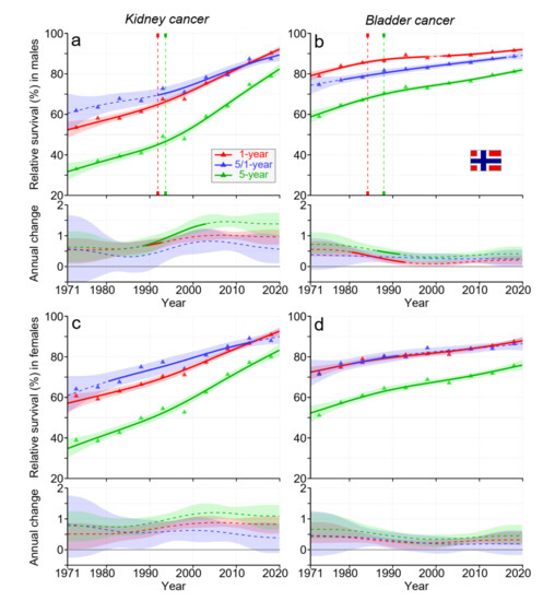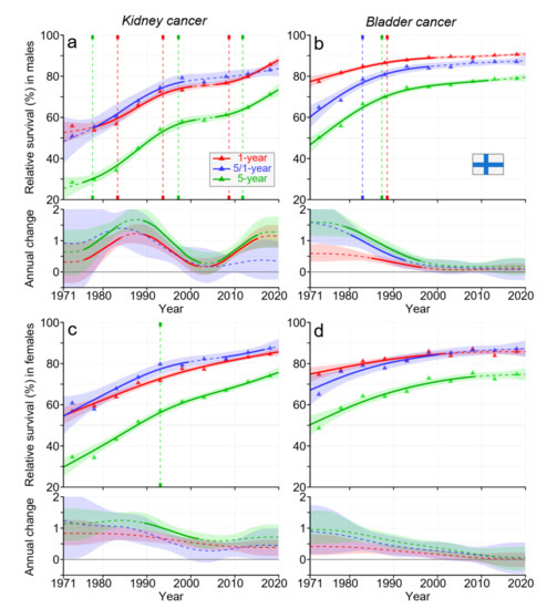 We could document the remarkably good improvement of 5-year survival in kidney cancer for which only 20–30% of the patients survived 5 years in 1971–1975 compared with some 75% survival in 2016–2020. Male 5-year survival in kidney cancer is still 5% units below that of bladder cancer, but female kidney cancer survival caught up with that of bladder cancer. The current guidelines for these cancers consider risk-adapted treatment with options for numerous types of immunotherapy [11,12].