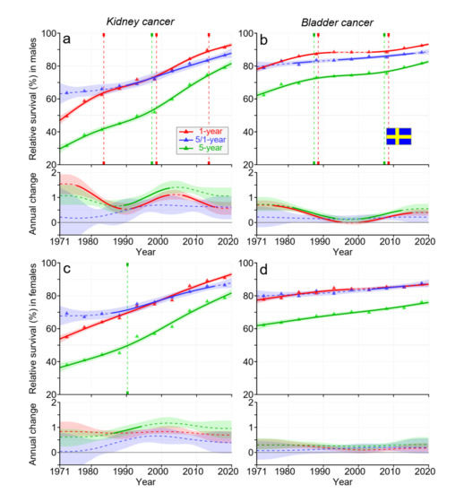 Relative 1-, 5/1-, and 5-year survival in Swedish men (a,b) and women (c,d) in kidney (a,c) and bladder (b,d) cancers. The vertical lines show significant breakpoints in survival trends, and the bottom curves show estimated annual changes in survival. The solid line in survival curves and annual change curve indicate a plausible trend (Section 2), whereas the dotted lines suggest otherwise. The shaded regions indicate 95% Bayesian credible intervals. All curves are color coded (see the insert).
