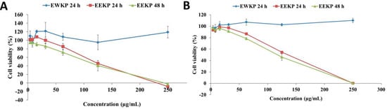 The cytotoxic activity result of EWKP and EEKP against 4T1 breast cancer cell line (A) and MCF-7 breast cancer cell line (B) in 24 h and 48 h.