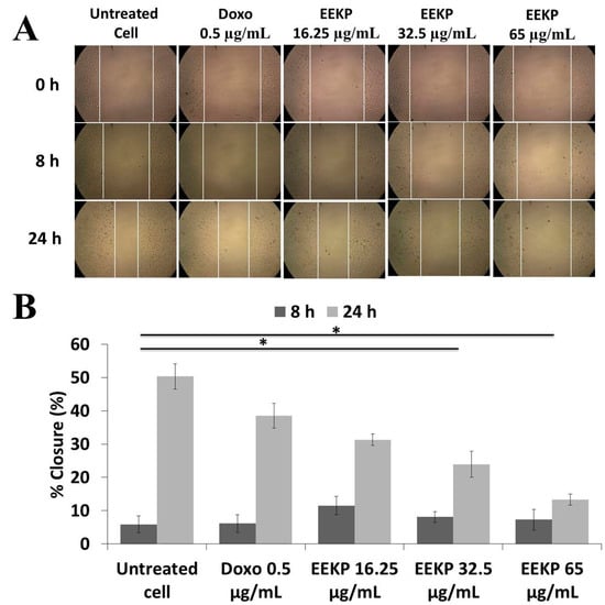 Effect of EEKP and Doxorubicin treatment on cell migration in 4T1 cells (A) Morphology of 4T1 cells after being treated with EEKP doses of 16.25 µg/mL, 32.5 µg/mL, and 65 µg/mL and doxorubicin 0.5 µg/mL. Observations were made at 0 h, 8 h, and 24 h using an inverted microscope with 100× magnification. (B) Percentage of 4T1 cell closure after 24 h of treatment. The wound area was analyzed using ImageJ software, then the % closure was calculated according to the analytical procedure. (*) indicates a statistically significant difference at the 95% confidence level (n = 3).