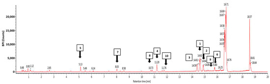 Ultra-High Performance Liquid Chromatography Mass Spectrophotometry (UHPLC-MS) chromatogram, acquired in the positive ion mode, from EEKP where peak labelling represents the compounds identified and listed in Table 3.