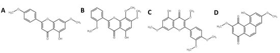 (A) 5-Hydroxy-7,4′-dimethoxyflavanone (HDMF), (B) 5-Hydro-7,8,2′-trimethoxyflavanone (HTMF), (C) Retusine, and (D) Denbinobin.