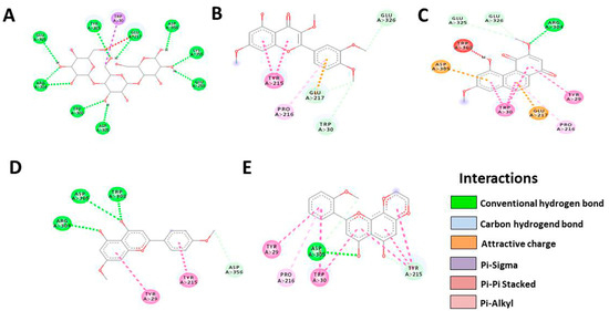 Illustration of bond prediction between native ligands (A), Retusine (B), Denbinobin (C), 5-Hydroxy-7,4′-dimethoxyflavone (HDMF) (D), 5-Hydroxy-7,8,2′-trimethoxyflavone (HTMF) (E) with ERK2 receptor.