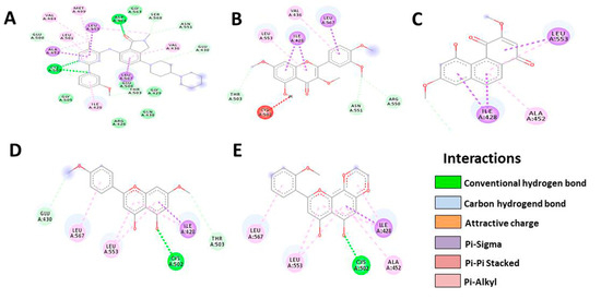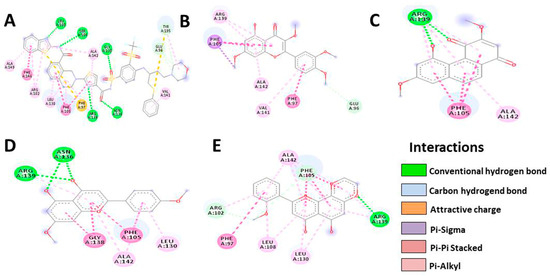 Illustration of bond prediction between native ligands (A), Retusine (B), Denbinobin (C), 5-Hydroxy-7,4′-dimethoxyflavone (HDMF) (D), 5-Hydroxy-7,8,2′-trimethoxyflavone (HTMF) (E) with Bcl-XL receptor.