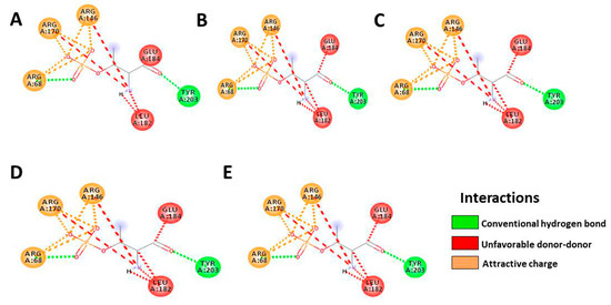 Illustration of bond prediction between native ligands (A), Retusine (B), Denbinobin (C), 5-Hydroxy-7,4′-dimethoxyflavone (HDMF) (D), 5-Hydroxy-7,8,2′-trimethoxyflavone (HTMF) (E) with FAK receptor.