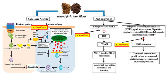 Several researchers have also reported KP’s anti-migration and antimetastatic activity, including in HeLa, SKOV3, HuCCA-1, and RMCCA-1 cell lines [20,22,29]. These three studies demonstrated that the ethanol extract of KP inhibited MMP-9 and MMP-2 production. However, the bioactive compound responsible for this activity is not particularly mentioned.