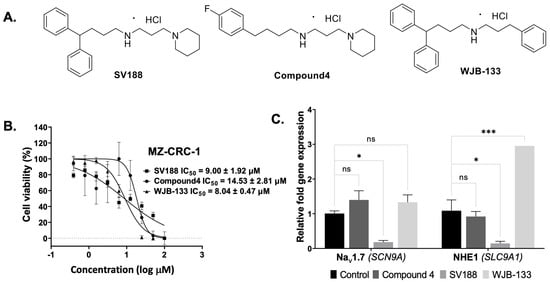 The effects of NaV1.5 inhibitors on the expression of NaV1.7 and related genes. (A) Chemical structures of NaV1.5 inhibitors used in the initial screening. (B) Cytotoxicity screening of the inhibitors using MZ-CRC-1 cells in an MTT assay; SV188 IC50 = 9.00 ± 1.92 µM, compound 4 IC50 = 14.53 ± 2.81 µM, and WJB-133 IC50 = 8.04 ± 0.47 µM. (C) mRNA expression of different genes of interest: NaV1.7 (SCN9A) and NHE1 (SLC9A) in MZ-CRC-1 cells after treatment with 5 μM of compound 4, SV188, and WJB-133 for 24 h. SV188 treatment significantly decreased the expression of NaV1.7 (p < 0.05, control: 1.01 ± 0.08, SV188: 0.18 ± 0.05), and NHE1 (p < 0.01, control: 1.09 ± 0.31, SV188: 0.15 ± 0.06). Target gene expression was normalized to the housekeeping gene, ribosomal protein S27. * p < 0.05, *** p < 0.001.