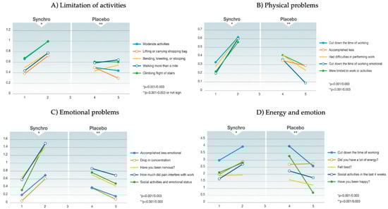 QoL score change. The figure details the graphic representation of the QoL score changes in the treatment group (Synchro) versus the control group (placebo) in the four main domains of the Short-Form 36 health status survey (A) limitation in activities; (B) physical problems; (C) emotional problems; (D) energy and emotion). As shown, in the treatment group, the health, mental and psychological status improved for many of the items considered, reaching statistical significance, while in the placebo group, those items either did not change or were impaired.