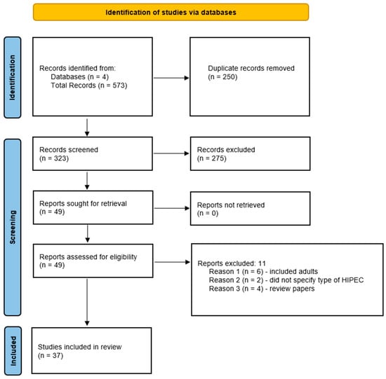 Without limiting the publication date, we systematically searched Scopus, PubMed, Embase, and CINAHL in February 2023. The search strategy utilized in all databases was as follows: (“hyperthermic intraperitoneal chemotherapy” OR “hyperthermic intraperitoneal perfusion with chemotherapy” OR hipec) AND (pediatric OR adolescent). No filters were applied. Four databases were searched including Scopus, PubMed, Embase, and CINAHL. Manual searching was also performed in the references of relevant articles for additional studies. The Scopus search yielded 258 results, PubMed yielded 229 results, Embase yielded 68 results, and CINAHL yielded 18 results, for a total of 573 results. A total of 250 duplicated records were removed before screening. Reasons for records that were excluded after screening include studies without pediatric patients, incorrect intervention, or incorrect focus, such as discussing anesthetic complications. Review papers, abstracts and conference papers were excluded from the review. Language was not considered as part of inclusion criteria although studies were excluded if an English version could not be obtained. This review is not officially considered a systematic review as not all sections during literature review were completed as part of the PRISMA 2020 checklist [6].
