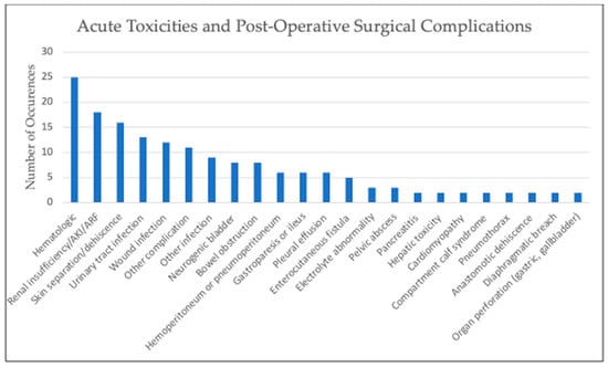 Graph of reported toxicities and surgical complications. “Hematologic” includes pancytopenia, anemia, or thrombocytopenia. “Other complication” includes one-time occurrences such as abdominal hematoma, cardiotoxicity, pancreatic leak, anorexia, elevated amylase levels, subclinical decrease in hearing, hyperbilirubinemia, transient femoral neuropathy, hemorrhage from right psoas, pulmonary embolism, and urinary obstruction. “Other infection” includes one-time occurrences such as perirectal abscess, bilious peritonitis, central venous catheter infection, bacteremia, pneumonia, sepsis, abdominal abscess, empyema, and bacterial diarrhea.