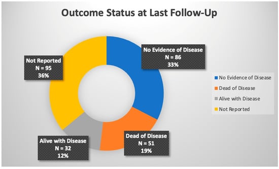 In total, 264 pediatric patients were included in this review. The most common malignancy was DSRCT (87), followed by mesothelioma (64), RMS (30), primary ovarian tumors (19), colon carcinoma (11), undifferentiated sarcoma (6), Wilms tumor (6), hepatocellular (5), and angiosarcoma (4), with the rest made up by other tumor types. Cisplatin was the most commonly used drug, either alone or in combination with other chemotherapy, for HIPEC at varying concentrations for 30–90 min in duration at temperatures of approximately 41–42 °C, yet there was slight variation present across these parameters; this data can be found in Table 1. Reported toxicities and complications were generally self-limited with the most common being pancytopenia, anemia, or thrombocytopenia; Figure 2 shows adverse effects. Post-operative mortality was considered within 30 days of procedure and there was no reported post-operative mortality. Tumor burden scoring measured via peritoneal cancer index, degree of cytoreduction, post-operative morbidity rate, and survival outcomes can be seen in Table 2 and Figure 3. Degree of tumor burden was not consistently reported. No evidence of disease was noted in 33% of subjects at last follow-up, although length of follow-up varied across the papers. Of patients surviving at time of last follow-up, median length of follow-up was 19.5 months with a standard deviation of 24.1 months.