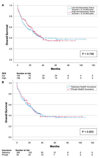 Univariate survival analysis revealed no association between socioeconomic status and survival (p = 0.748, Figure 1A). Similarly, the type of health insurance (SHI vs. PHI) was not associated with overall survival (p = 0.903, Figure 1B).