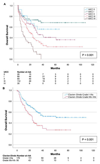 Kaplan–Meier survival curves split by UICC tumor stage (A) and severity of postoperative complication according to Clavien–Dindo (B). An advanced tumor stage and severe postoperative complication (Clavien–Dindo grade IIIb–IVb) were related to shorter overall survival (p < 0.001).