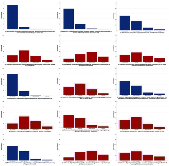 (a–o): Relevance of supportive perioperative measures. Supportive measures rated as very relevant by patients (C1–C6) were displayed in blue color, all others were displayed in brown color. Legend: CERT, certified prostate cancer center; NCERT, non-certified center.