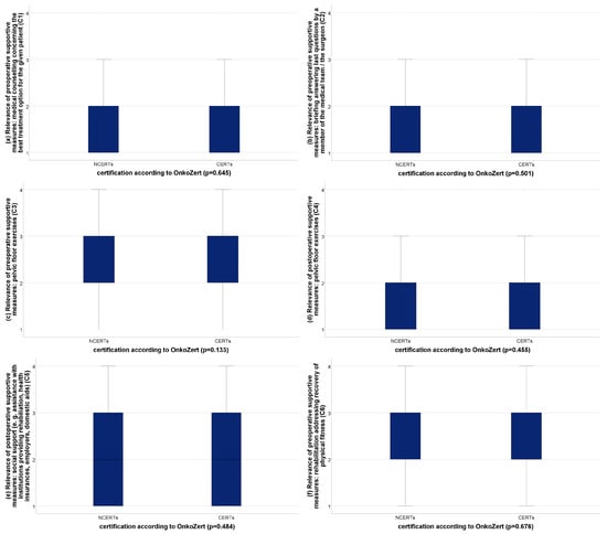 The patients rated six of the fifteen supportive measures as very relevant: preoperative medical counselling concerning the best treatment option (criterion 1, C1), a preoperative briefing answering last questions given by a member of the medical team/the surgeon (C2), preoperative pelvic floor exercises (C3), postoperative pelvic floor exercises (C4), sufficient postoperative social support (C5), and postoperative rehabilitation addressing the recovery of physical fitness (C6) (Figure 1a–o, displayed in blue color, all others displayed in brown color). None of these ratings showed a significant difference concerning the effective availability estimated by the patients between CERTs and NCERTs (p = 0.133–0.676) (Figure 2a–f).