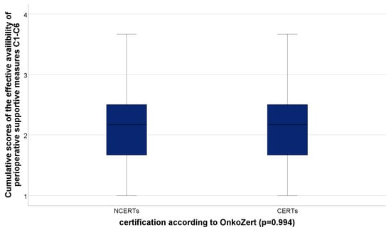 Merging the ratings of the subjectively perceived availability of those supportive measures that were rated very relevant by patients (C1–C6) within a cumulative score resulted in a median of exactly 2.17 (IQR: 2.16–2.50) for the effective availability ratings of both groups, CERTs and NCERTs, with no statistically significant difference (p = 0.994) (Figure 3).