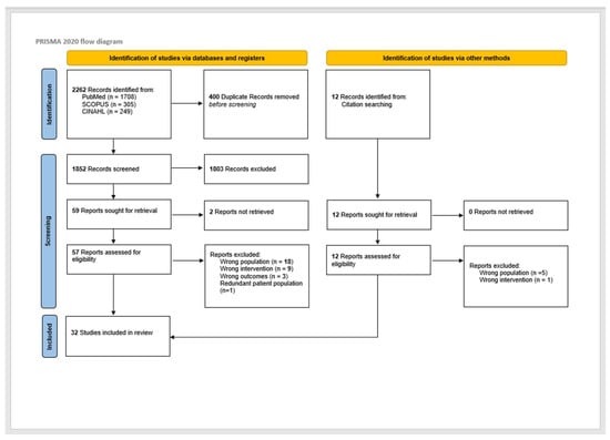 This review was conducted in compliance with PRISMA-ScR scoping review methods [15]. The initial search yielded 2262 reports. There were 400 duplicate reports. After duplicates were removed, 1852 titles and abstracts were screened by two independent reviewers (A.N.T. and S.R.S.) for assessment against the inclusion criteria, and conflicts were resolved by discussion. A total of 59 records were assessed for eligibility, with 31 reports excluded at the full-text stage. Eighteen reports had the wrong population. There were nine reports with the wrong intervention. Three reports were due to wrong outcomes, and one was due to redundant patient population. Thirty-two (26 from databases and registers and 6 from citation searching) full-text screenings of selected citations were done independently by the same reviewers (A.N.T. and S.R.S.), and any disagreements were resolved through discussion. The results of the study inclusion process are presented in a PRISMA-ScR flow diagram (Figure 1).