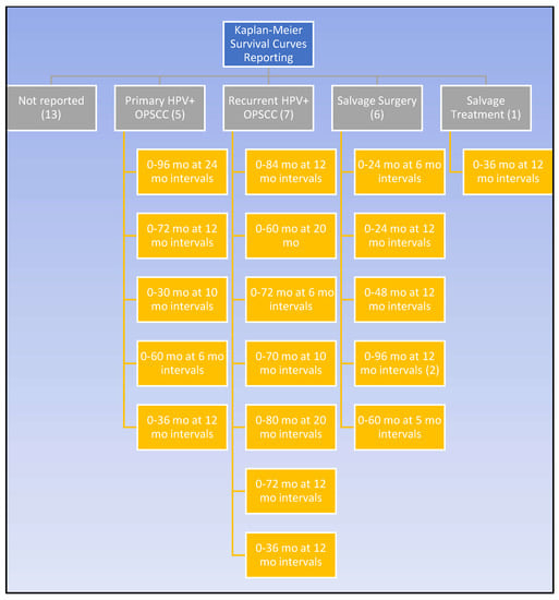 In addition to the numerical parameters, survival was graphically appraised through K-M curves. As exhibited by Figure 3, K-M survival curves were displayed in over half of the studies but with tremendous irregularity. The time frame and interval markers of the K-M curves differed greatly between studies. Like the survival outcomes, K-M curves assessed various patient groups, such as patients with primary HPV-positive OPSCC disease, patients with recurrent disease, and patients treated with any salvage treatment. SS patients specifically were limited to six articles. Of these six studies, only two shared the same time range and interval markers [11,12,13,14,30,31,37,52]. Median post-recurrence survival was reported in four studies, ranging from 13–151.2 months; however, this was not specific to SS patients [27,30,35,42,46].